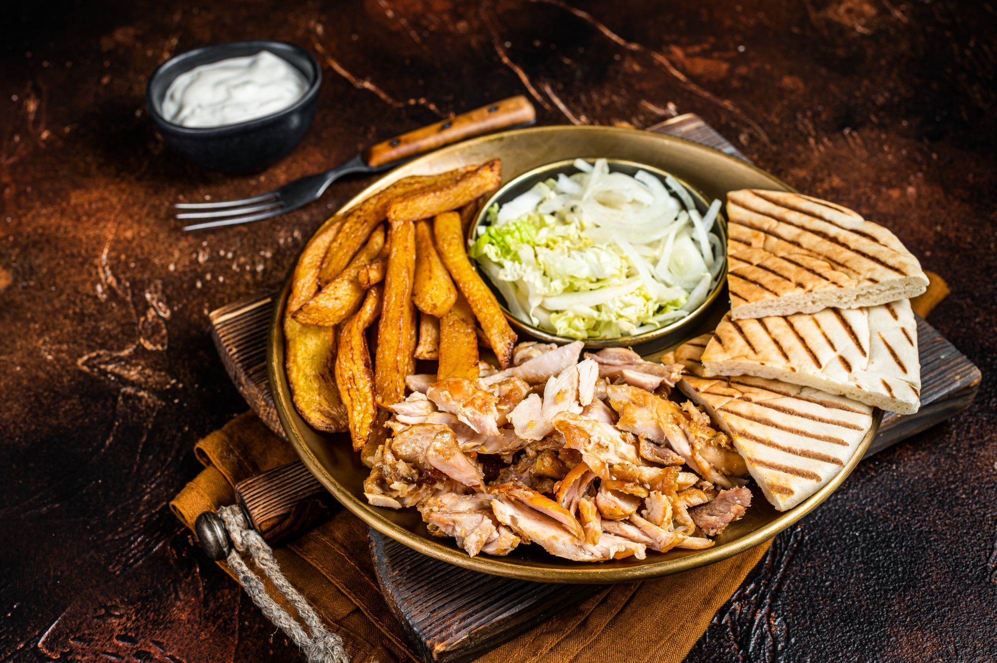 Mięso, frytki, surówka, warzywa, sosy. -